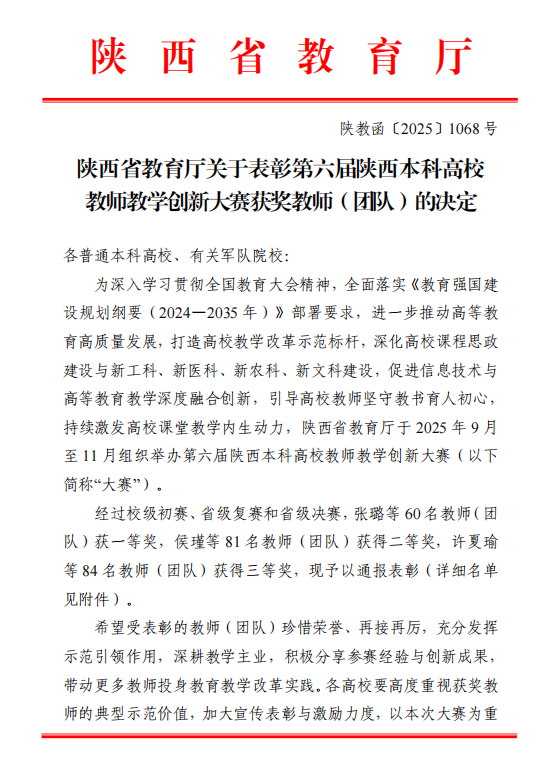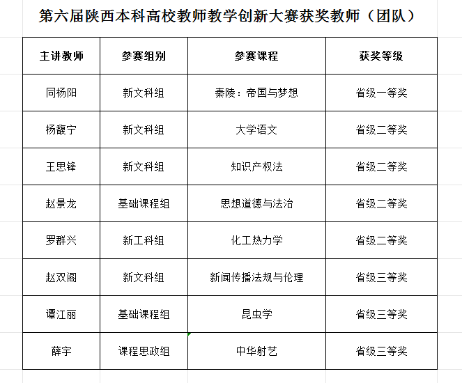 近日,陕西省教育厅公布了第六届陕西本科高校教师教学创新大赛获奖名单,我院王思锋教授团队获得二等奖。