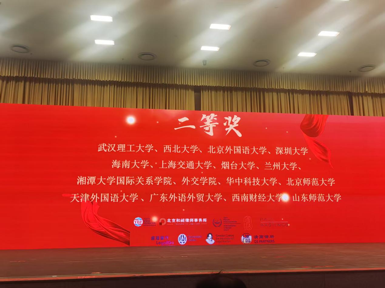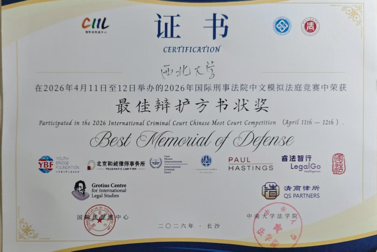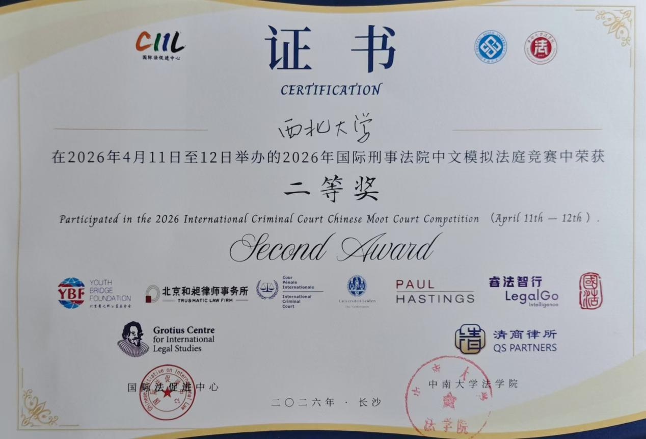 2026年4月10日至4月12日,由中南大学承办的2026年国际刑事法院中文模拟法庭竞赛正赛在长沙圆满落幕。我院代表队成功晋级全国总决赛,荣获二等奖第二名,同时摘得最佳辩护方书状单项荣誉,刷新我校在本项赛事中的最佳成绩。