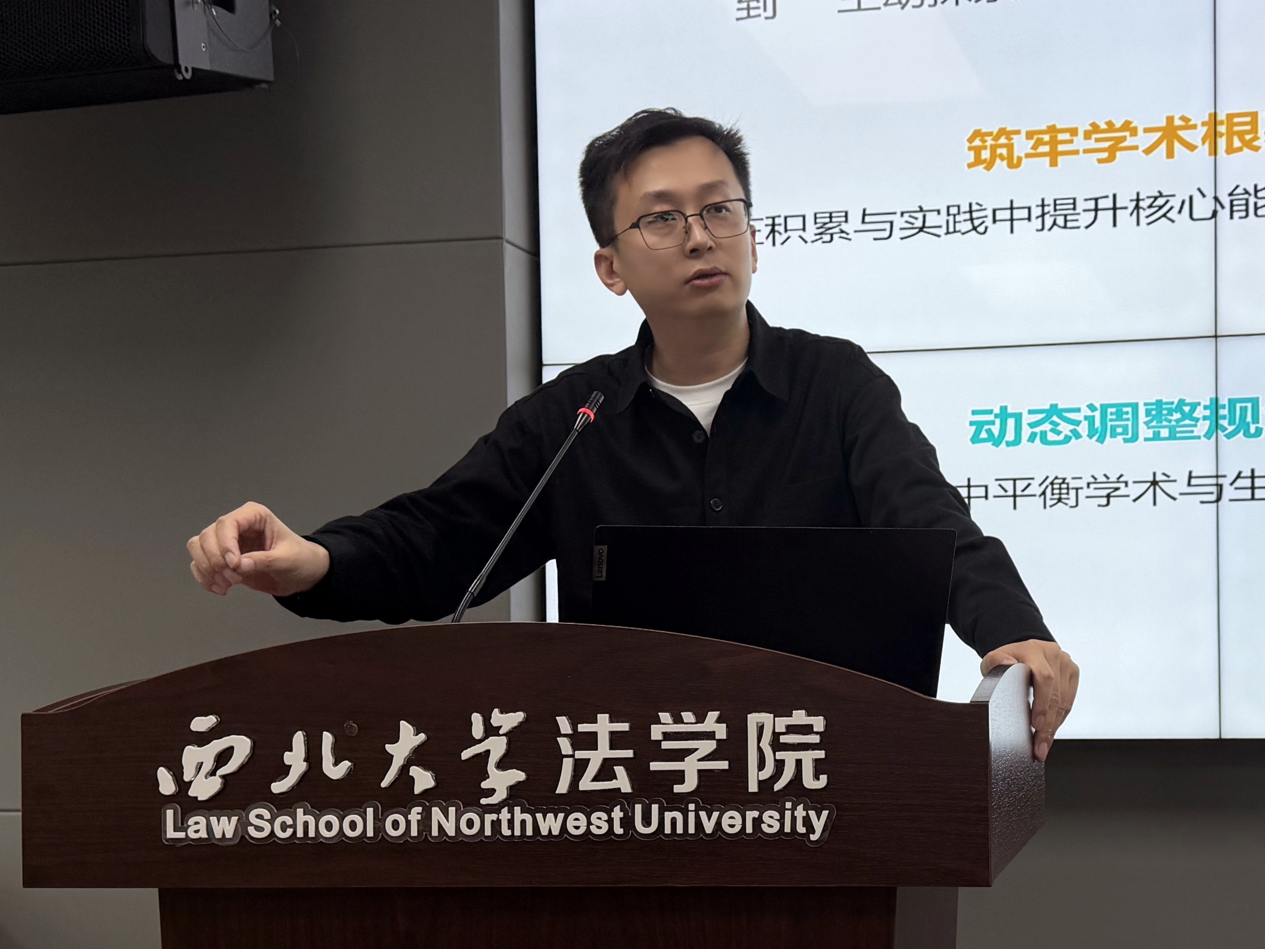 随后,刘桢老师从认清阶段差异、精准定位方向、筑牢学术根基、严守学术底线、动态调整规划五个维度为同学们进行了深入浅出的剖析和建议。他指出研究生阶段首先要将思维从“被动接受”转到“主动探索”,在兴趣与需求的交汇点寻找自己的具体研究领域和方向。在明确规范学术底线的前提下,用具体的积累与实践提升核心能力,以练代学,在干中学。同时也要将兴趣、积累与需求结合起来,灵活地平衡研究生三年的学术和生活。刘桢老师表示,同学们可以在目标牵引下进行学术学业生涯规划,脚踏实地,潜心深耕,走好研究生学业与科研之路,将自己的青春热血融入法学研究的光辉事业。