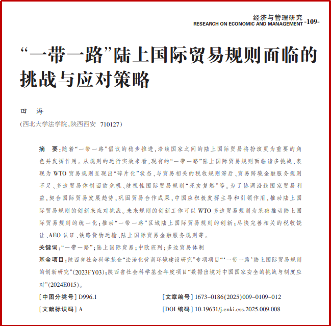 近日,学院田海副教授的论文“‘一带一路’陆上国际贸易规则面临的挑战与应对策略”在CSSCI来源期刊《重庆社会科学》2025年第9期发表。该文是田海副教授主持的陕西省社会科学基金专项项目“‘一带一路’陆上国际贸易规则的创新研究”(2023FY03)的阶段性成果。