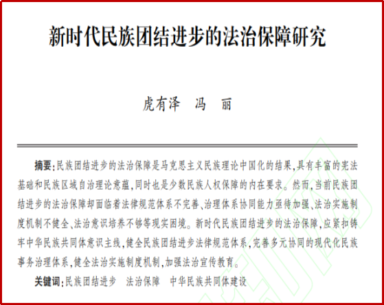 近日,学院虎有泽教授的论文“新时代民族团结进步的法治保障研究”在CSSCI来源期刊《湖北民族大学学报》2025年第6期发表。该文是虎有泽教授主持的国家社科基金重点项目“构建铸牢中华民族共同体意识的法律体系研究”的阶段性成果。