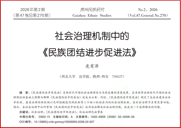 近日,虎有泽教授在CSSCI来源期刊《贵州民族研究》发表题为“社会治理机制中的《民族团结进步促进法》”的论文。